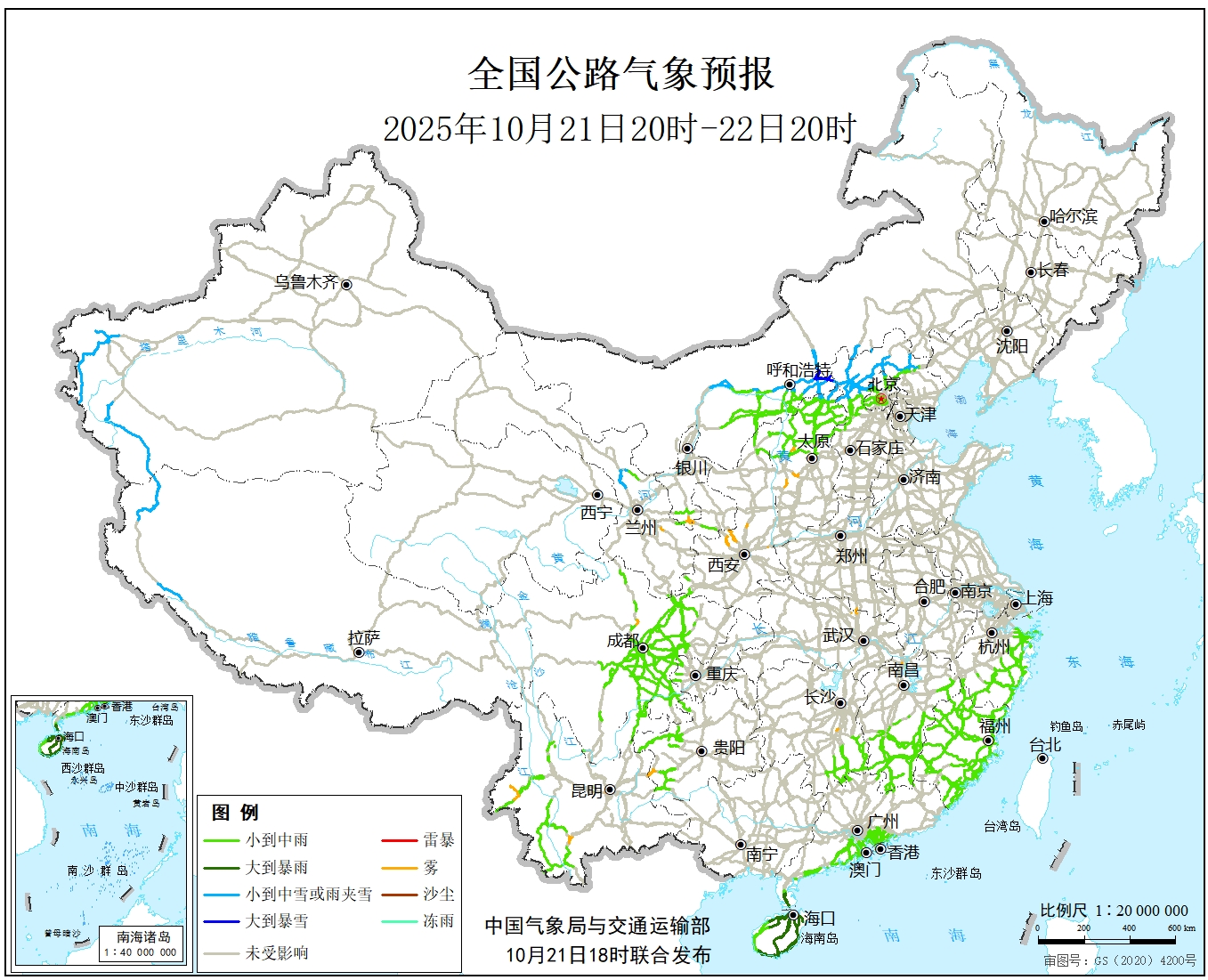 中国气象局与交通运输部2025年10月21日联合发布全国主要公路气象预报