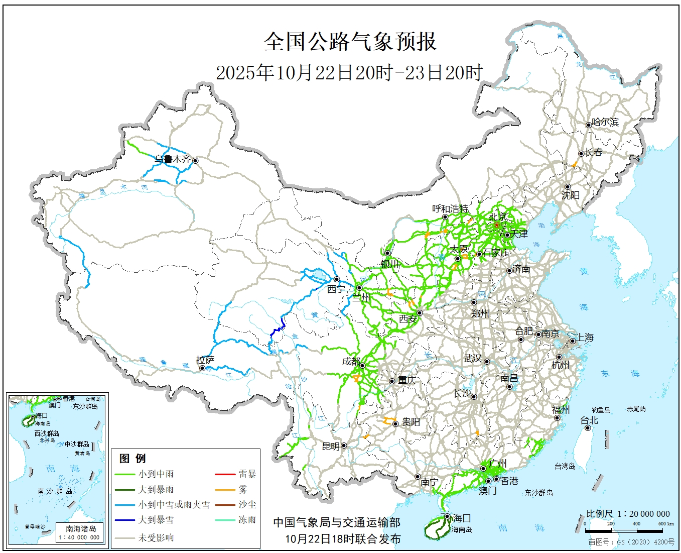 中国气象局与交通运输部2025年10月22日联合发布全国主要公路气象预报