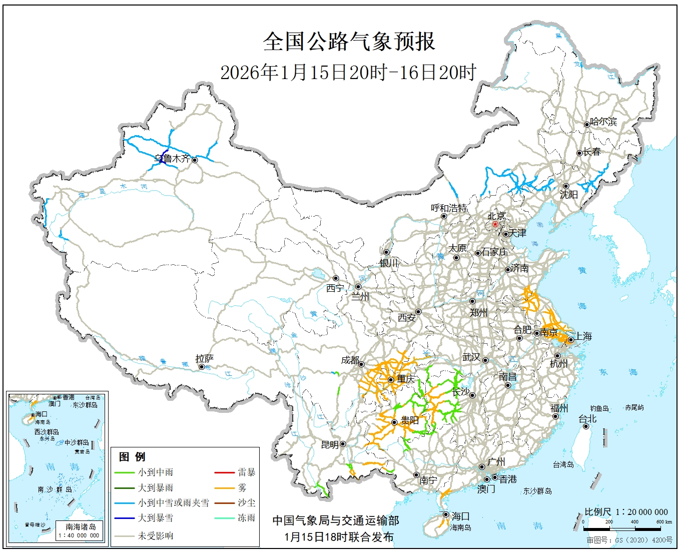 中国气象局与交通运输部2026年01月15日联合发布全国主要公路气象预报