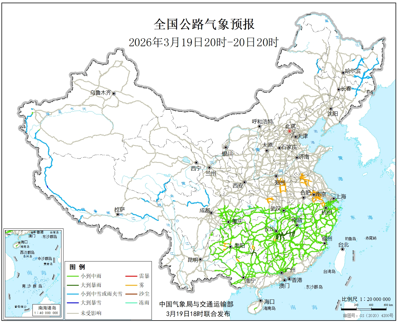 中国气象局与交通运输部2026年03月19日联合发布全国主要公路气象预报